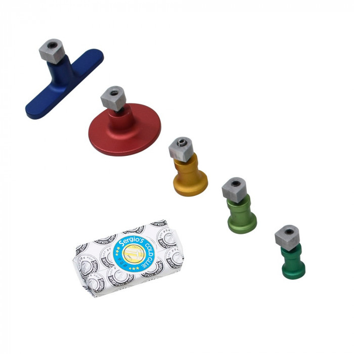 Contém - 1 ventosa de 14mm - 1 ventosa de 20mm - 1 ventosa de 24mm - 1 ventosa de 50mm - 1 ventosa de vinco 15x72mm - 1 Cola fria Azul